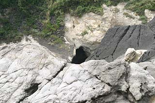 写真9や写真10の位置から、潮風の丘を左手に見ながら進んで行くと、写真15のような風景が見られます。ウルトラQ「海底原人ラゴン」で、万城目がラジオを使ってラゴンを誘導していたのが写真15の丘です。写真16はその一部を拡大したもので、19分55秒にラゴンが海へ落ちた場所です。ちなみに写真16の岩場は写真7や写真8の岩場です。