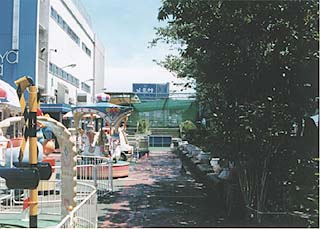 左の写真には、ペットショップ(手前)と小さな遊園地(奥)が見られます。 そしてその遊園地側から、ペットショップを見たのが右の写真です。 右の写真奥にはゴルフ練習場があるのですが、 チブル星人が追いつめられたのはおそらくそのゴルフ練習場の辺りだと思われます。