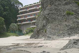 写真5は西端にある岩場で、セブン「ノンマルトの使者」ラストで「ウルトラ警備隊の馬鹿野郎」と叫ぶ真市少年が立っていた場所です。ダンとアンヌと同じようにこの岩場の向こう側をのぞくと、写真6のような岩場を見ることができます。写真6はセブン「ノンマルトの使者」ラストで真市の母親が立っていた場所です。この岩場には、ビデオ映像と同様に、人為的に作られたと思われる四角い穴もあります。