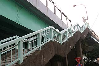 写真2の奥には佃大橋の階段があります。写真3はその階段の下の写真です。帰りマン第46話5分4秒、紙芝居屋(ズール星人)に突き落とされた子供の前でMATビハイクルが急停車した場所です。